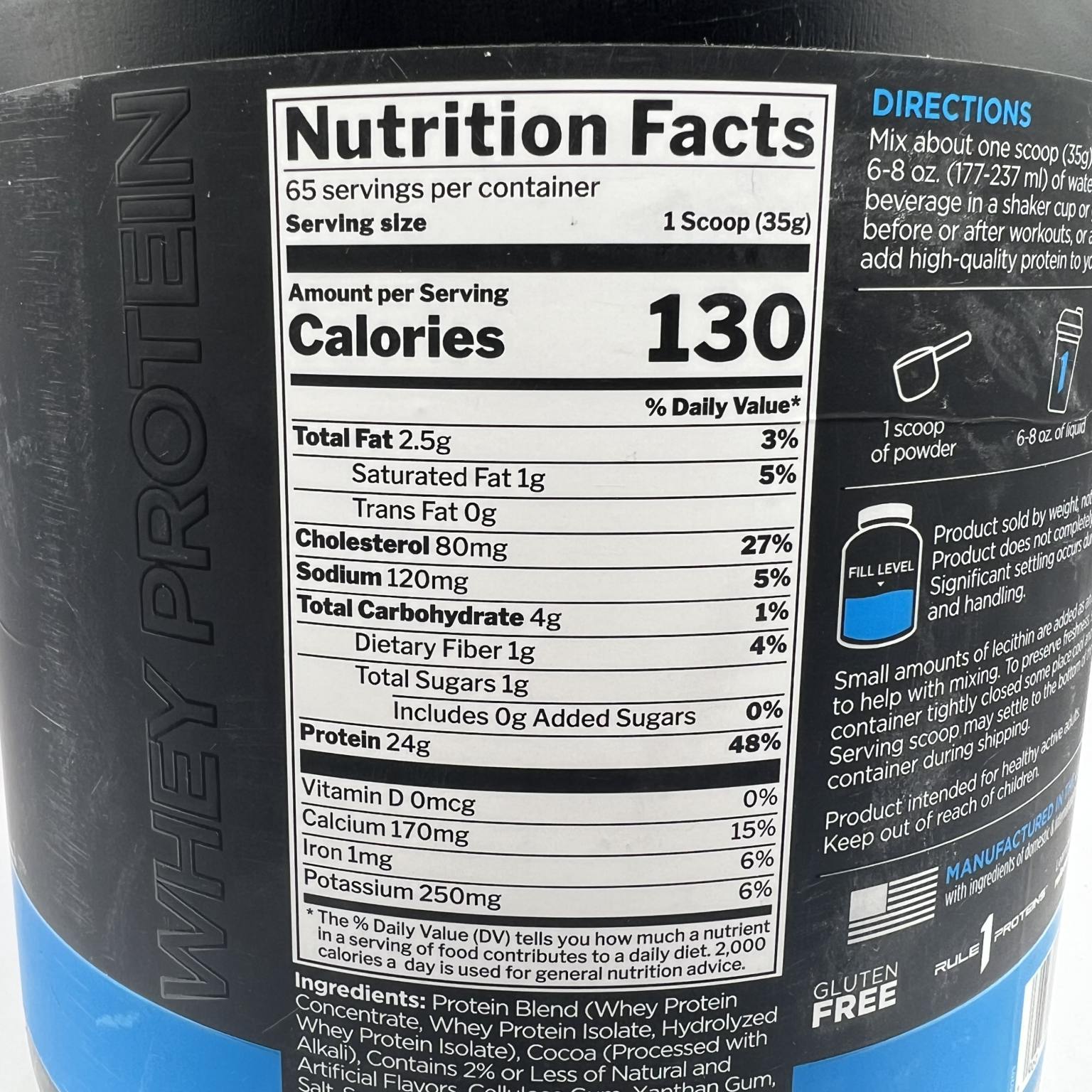 هر وعده (34 گرم) حاوی 130 کیلو کالری، 24 گرم پروتئین، 4 گرم کربوهیدرات، 2 گرم چربی